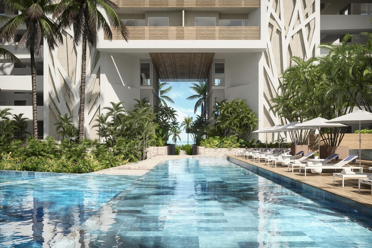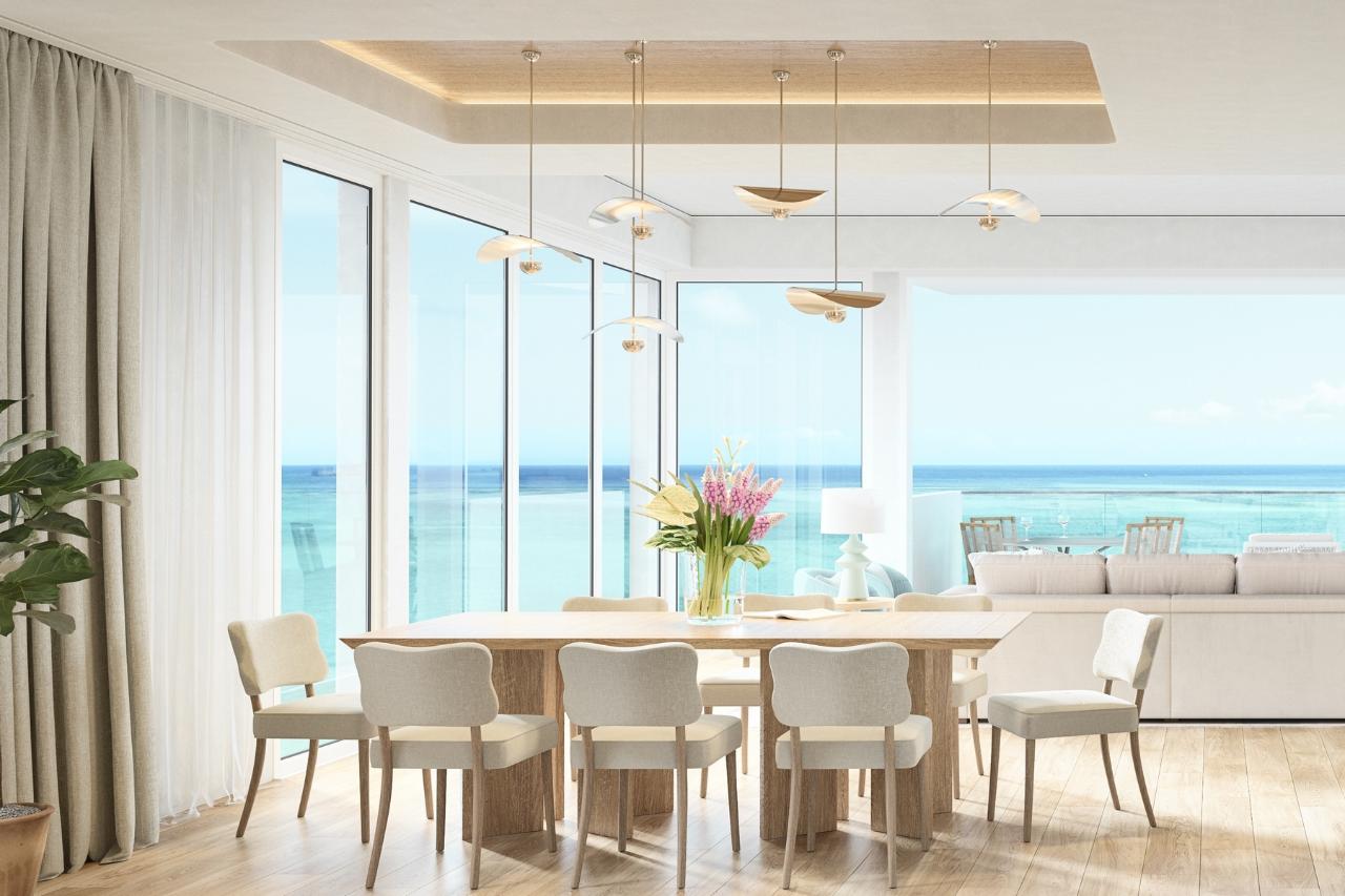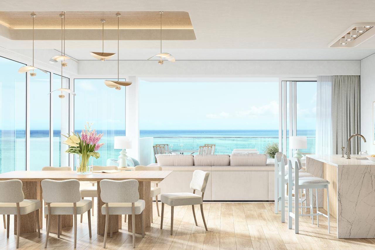 Impeccably designed for wow-factor and functionality, The Point’s signature three-bedroom layout boasts two primary bedrooms including an oceanfront ‘lockout’ for optimal owner and rental flexibility, and a gracious two-bedroom main unit. The residences enjoy a corner position in the building with a 24’+ wide great room, ceiling heights in main living areas at approximately 10’ or greater, superbly appointed island kitchen, a private and lockable office nook, and two ocean-facing terraces opening onto private plunge pool. Both primary bedrooms feature bathrooms with free-standing tub and double vanity and private water closet – all with high-end custom cabinetry and sophisticated high-end materials, fixtures and appliances. This design is available on level 1-only. Floorplan same on higher floors without plunge pool. Spanning over 9.5 acres, The Point is an exceptional low-density oceanfront development of the highest caliber. The development comprises 38 stunning oceanfront condominiums and 16 innovative “casitas”, and 4 pool lofts ranging from one to five bedrooms, along with a diverse range of new resort amenities. These include a new adults-only swimming pool and three additional pools for families, new oceanfront dining and bars, a new world-class spa and fitness center, tennis and pickle ball courts, a discovery center for kids, and a new arrival pavilion. All of these amenities have been redesigned with a new entrance off the main thoroughfare of Grace Bay. The Point is envisioned by award-winning SWA Architects (designer of Point Grace), one of Providenciales’ most accomplished design firms, and Young Huh Interior Design, an AD-100 and Elle Décor A-List rising star. It is destined to become one of the most sought-after addresses in Turks & Caicos.
