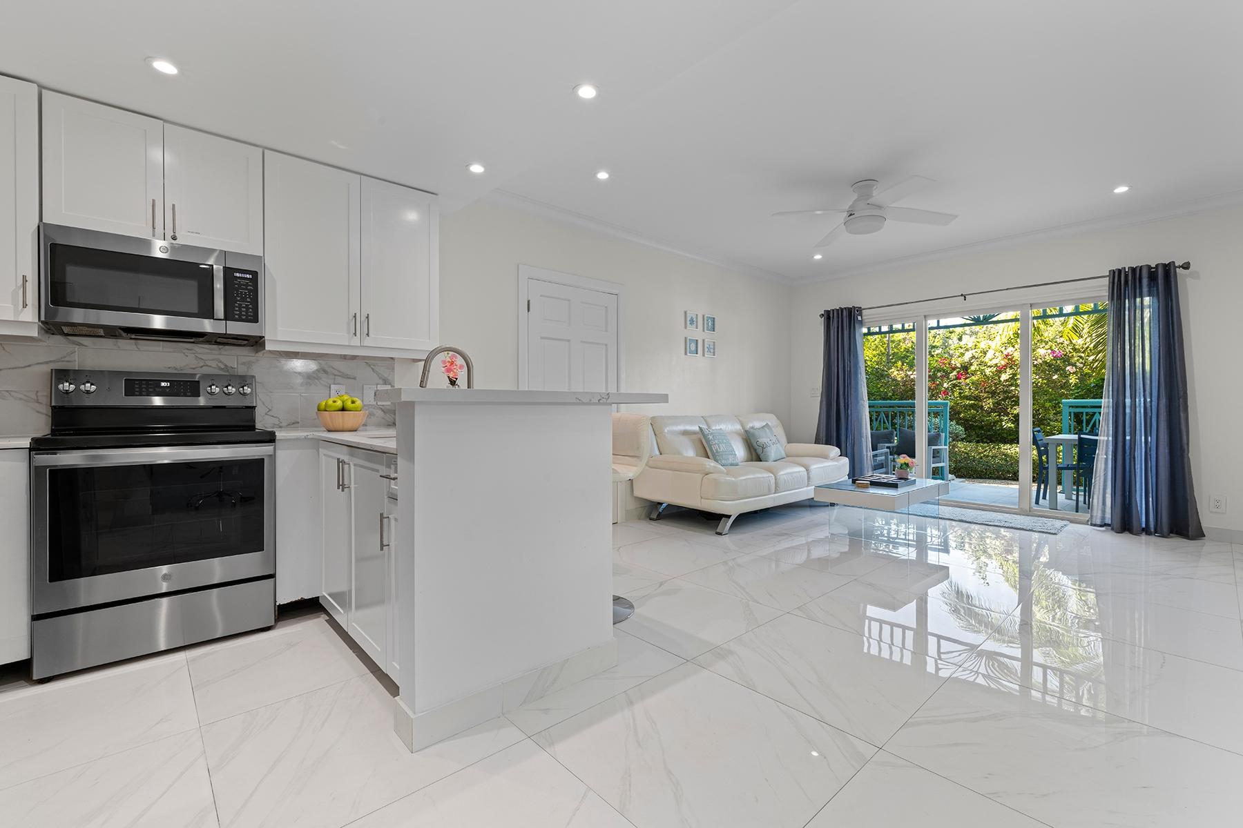 Ground Floor | East-Facing | Parking Convenience & Light Unit A106 is a ground-floor, 1-bedroom, 1-bath residence and the mirror-image floor plan of Unit A101, ideally positioned on the east façade of Building A. This location provides enhanced morning sunlight and improved airflow, with east-facing windows in both the living area and bedroom. This 1-bedroom, 1-bath unit features a central entry framed by a covered, arched portico, framed by lush tropical landscaping, creating a sense of arrival and enhanced architectural appeal. A standout feature of A106 is its convenient proximity to two parking spaces near the main entry gate, providing easy access for owners and guests—an often overlooked but highly valuable benefit for short-term rentals. With approximately 900 square feet of interior space, this VRBO/Airbnb-approved unit is located in a secure, landscaped complex that includes a communal pool, gazebo, barbecue area, and guest parking. Just minutes from Grace Bay Beach and surrounding luxury amenities, Unit A106 combines practicality, comfort, and investment appeal in one of Leeward’s most established condo communities.